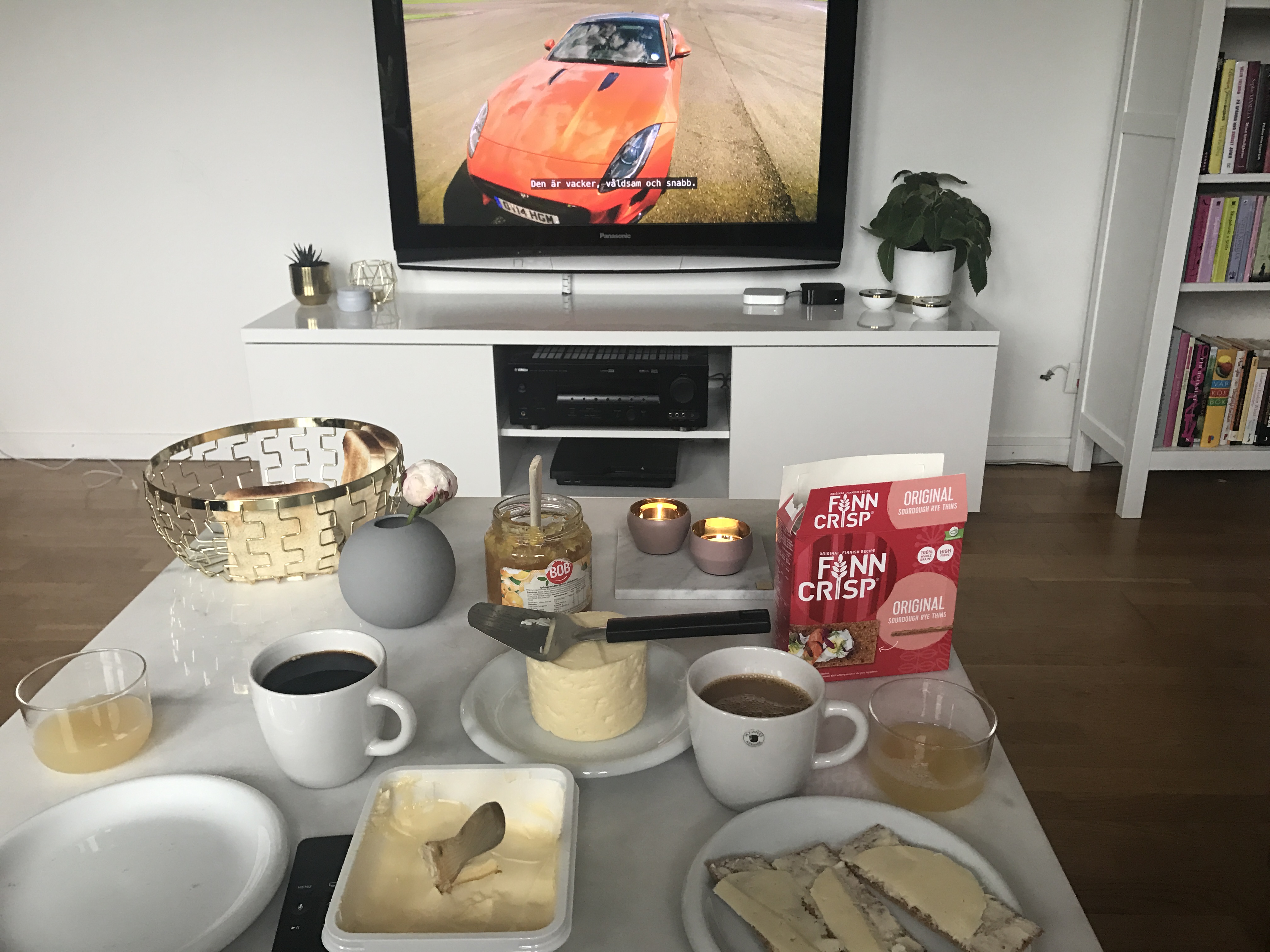 På lördagen tog vi sovmorgon och sedan dukade R upp frukost i vardagsrummet som vi åt till ett avsnitt Top Gear. Min Leon kom hem efter att ha varit borta i två dagar. Han var så ”mammig” och skulle ligga på mig i soffan. Så mysigt.
